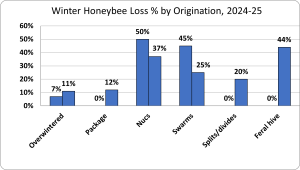The survey also asked for hive loss by hive origination. The members reported 7% loss of previously overwintered colonies (3 of 42 lost); statewide loss level was 11%. There were no overwintered hives originating from packages; one of two nuc-originated colonies survived. Splits had better survival (no losses of 10 fall colonies) than swarm-originated overwintered colonies (5 of 11 not successful).