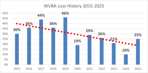Statewide, and for WVA respondents as years of experience increase, the loss level percentage decreases. The seven WVBA individuals with 1-3 years’ experience had 39% loss level, the five individuals with 5 to 9 years’ experience had 25% loss level and the 5 individuals with 11 to 36 years’ experience had 19% loss level.
